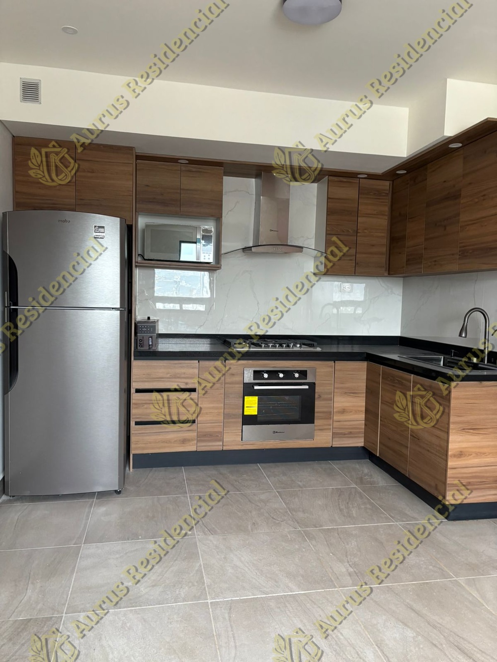 Cocina equipada con estufa, campana y refrigerador — lista para mudanza inmediata.